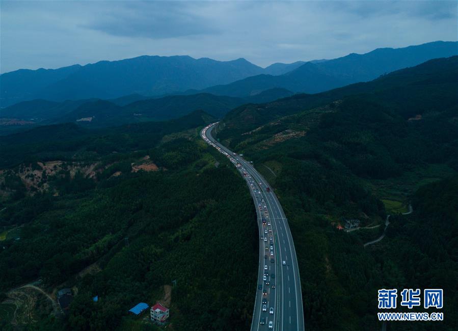10月6日,G3京台高速福建省福州市闽清县附近出现拥堵(无人机照片)。 随着长假进入尾声,福建多地出现返程高峰,高速道路车流量增大,部分路段出现拥堵现象。 新华社记者 宋为伟 摄
