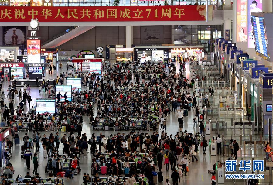 10月7日,旅客在上海虹桥站候车大厅内候车。 国庆长假临近尾声,上海虹桥站迎来旅客返程高峰。 新华社记者 刘颖 摄