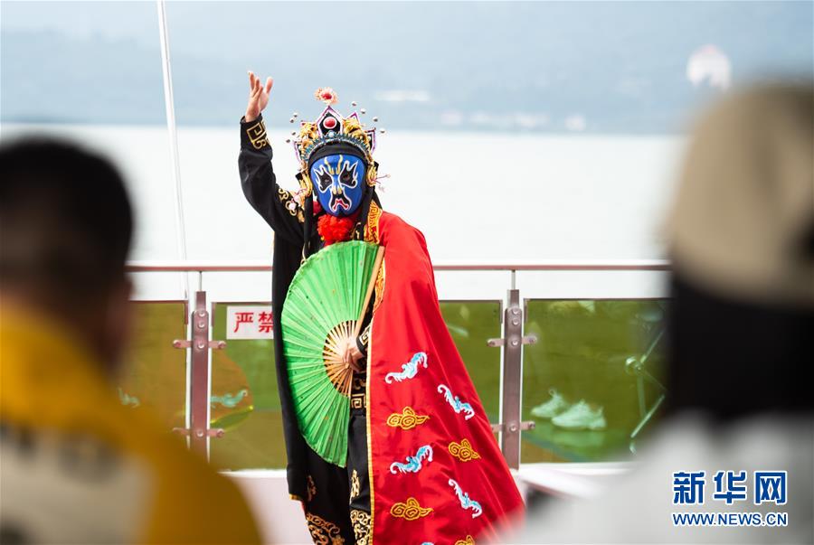 10月7日,观众在昆明滇池水域的一艘游艇上观看叶默的川剧变脸表演。新华社发(王冠森 摄)