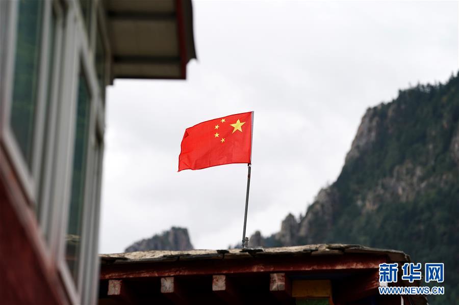 西藏昌都市江达县岗托村一户人家的屋顶上国旗飘扬(9月24日摄)。新华社记者 詹彦 摄