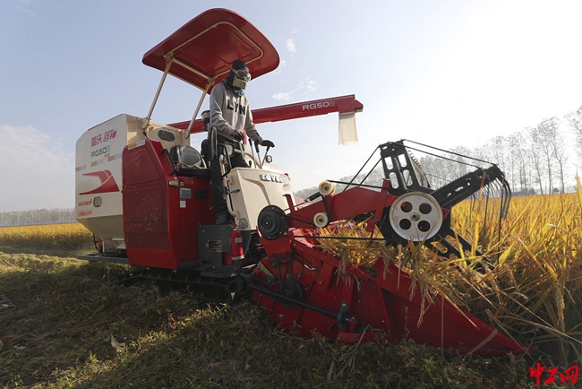 2020年10月10日,在江苏省连云港市赣榆区金山镇西张夏村,农机手驾驶收割机收割水稻。