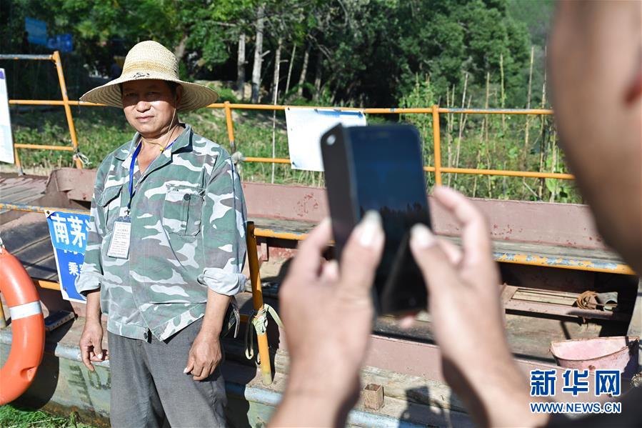 10月10日,在福建省南平市浦城县水北街镇茅洲渡口,渡工何荣兴请乡亲帮他和渡船拍一张合影。新华社记者 宋为伟 摄