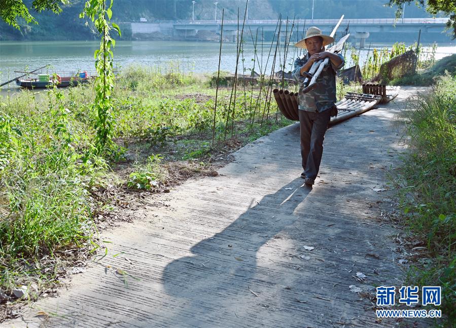 10月10日,在福建省南平市浦城县水北街镇茅洲渡口,渡工何荣兴在最后一次摆渡后将船桨扛上岸。新华社记者 宋为伟 摄