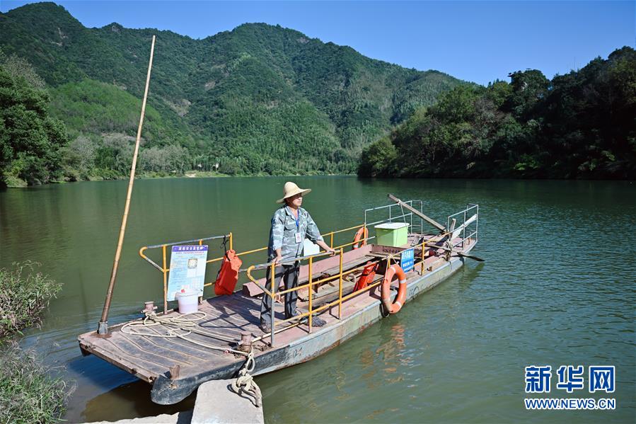 10月10日,在福建省南平市浦城县水北街镇茅洲渡口,渡工何荣兴望着远方,等待钩机来将船拖上岸。新华社记者 宋为伟 摄