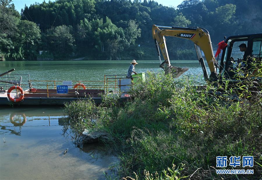 10月10日,在福建省南平市浦城县水北街镇茅洲渡口,渡工何荣兴在搬运船上的救生物资。随后,钩机将把渡船拖上岸。新华社记者 宋为伟 摄