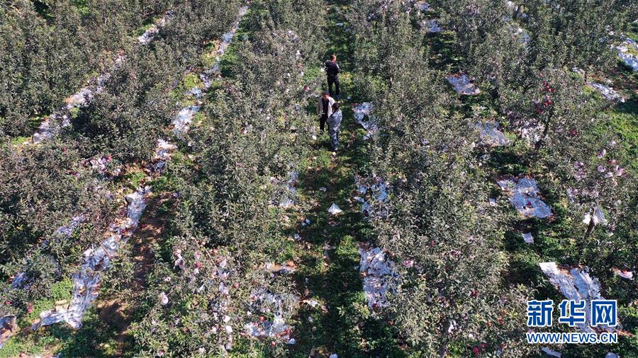 这是10月13日拍摄的天津市蓟州区西葛岑村果园(无人机照片)。 金秋时节,天津市蓟州区西葛岑村迎来了硕果飘香的季节,到处是一派丰收景象。近年来,西葛岑村发展苹果及“中华寿桃”种植产业,带领村民走上致富之路。 新华社记者 马平 摄