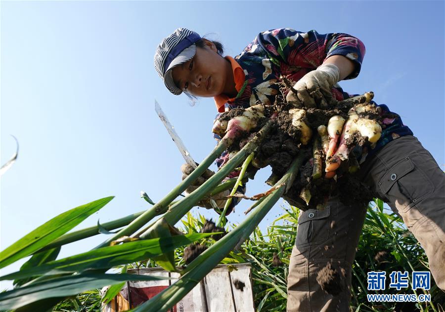 10月15日,唐山市丰润区新军屯镇梁庄子村农民在田间收获生姜。 近年来,素有“冀东生姜之乡”美誉的河北省唐山市丰润区积极推广“公司+合作社+基地”的模式,规模化发展生姜种植,让农民实现增收。据介绍,今年该区生姜种植面积达6万多亩,预计产量达33万吨。 新华社记者 杨世尧 摄