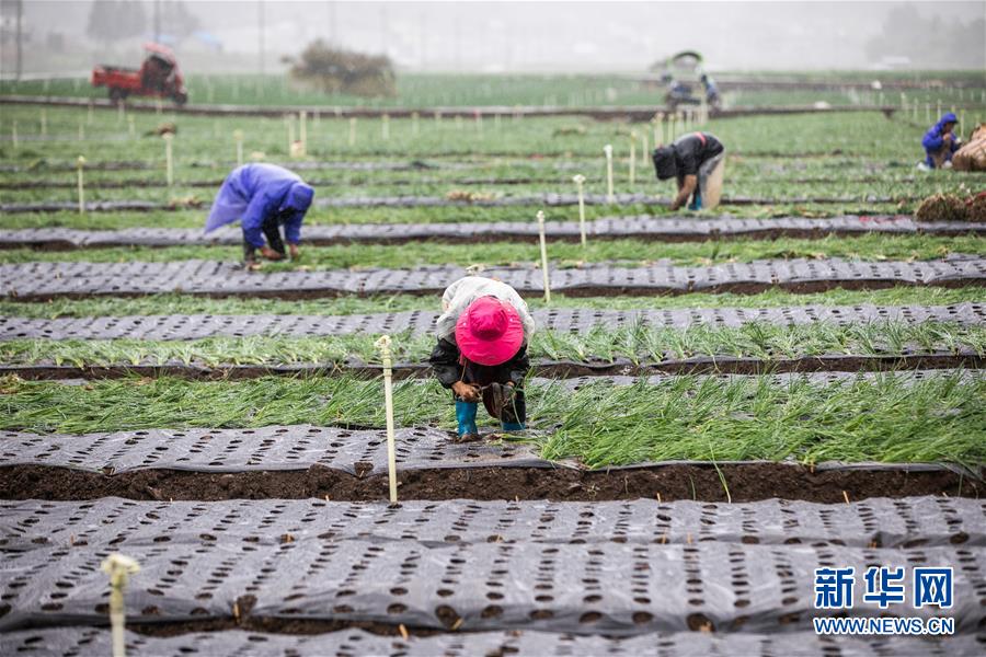 10月15日,村民在位于贵州省毕节市赫章县松林坡乡半边街社区的香葱基地里种植香葱。 金秋时节,位于贵州省毕节市赫章县松林坡乡半边街社区的香葱基地里一派繁忙景象,村民们抢抓农时冒雨搬运、分拣、栽种香葱。 近年来,毕节市利用乌蒙高原山地冷凉的气候特点,大力推进全市香葱产业结构调整。2020年,全市香葱种植面积10余万亩,预计产量超过13万吨,预估产值4亿元以上。 新华社发(罗大富 摄)