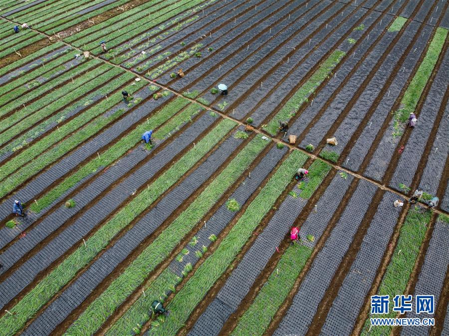 10月15日,村民在位于贵州省毕节市赫章县松林坡乡半边街社区的香葱基地里种植香葱(无人机照片)。 金秋时节,位于贵州省毕节市赫章县松林坡乡半边街社区的香葱基地里一派繁忙景象,村民们抢抓农时冒雨搬运、分拣、栽种香葱。 近年来,毕节市利用乌蒙高原山地冷凉的气候特点,大力推进全市香葱产业结构调整。2020年,全市香葱种植面积10余万亩,预计产量超过13万吨,预估产值4亿元以上。 新华社发(罗大富 摄)