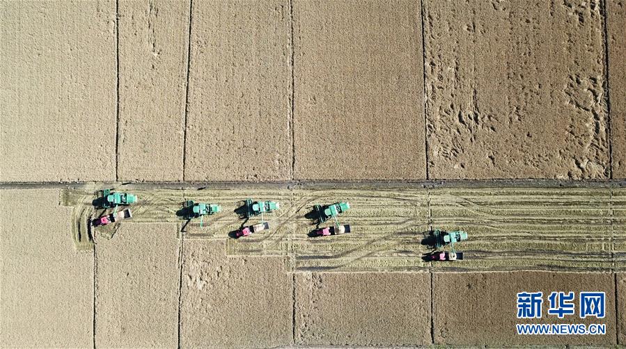 10日16日,大农机在位于三江平原的黑龙江省红卫农场的田间向运粮车放出刚收获的水稻(无人机照片)。 时下正值“北大仓”黑龙江省的秋收季,现代化大农机在三江平原忙碌收获。 新华社记者王建威摄
