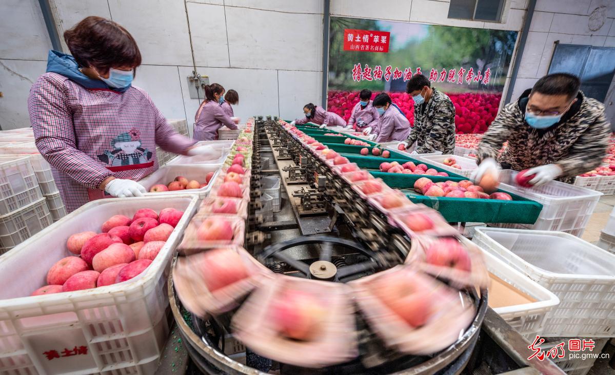 2020年10月15日,在山西省万荣县"黄土情"苹果基地车间内,工作人员正在分拣苹果。该县35万亩苹果进入收获期,总产量预计达64万吨。苹果产业已成为当地农民增收的一大支柱产业。(薛俊摄/光明图片)