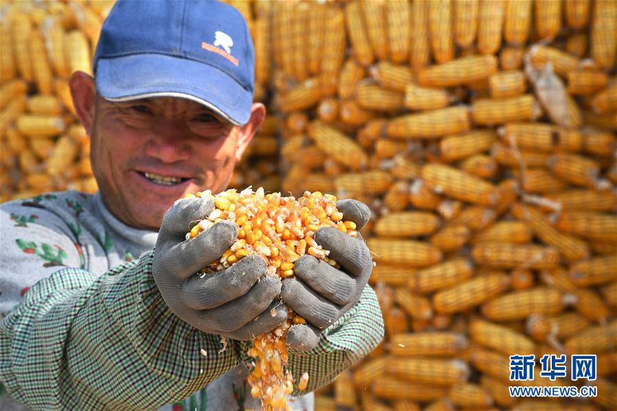 10月19日,青岛莱西市夏格庄镇官庄村村民褚言说,今年玉米颗粒饱满能卖个好价钱。 近日,山东青岛340多万亩玉米喜获丰收,田间、地头、村居庭院处处可见金黄遍地的景象,当地农民利用晴好天气抓紧脱粒晾晒,确保颗粒归仓。 新华社记者 李紫恒 摄