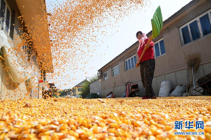 10月19日,青岛莱西市夏格庄镇官庄村村民张淑萍在晾晒玉米。 近日,山东青岛340多万亩玉米喜获丰收,田间、地头、村居庭院处处可见金黄遍地的景象,当地农民利用晴好天气抓紧脱粒晾晒,确保颗粒归仓。 新华社记者 李紫恒 摄