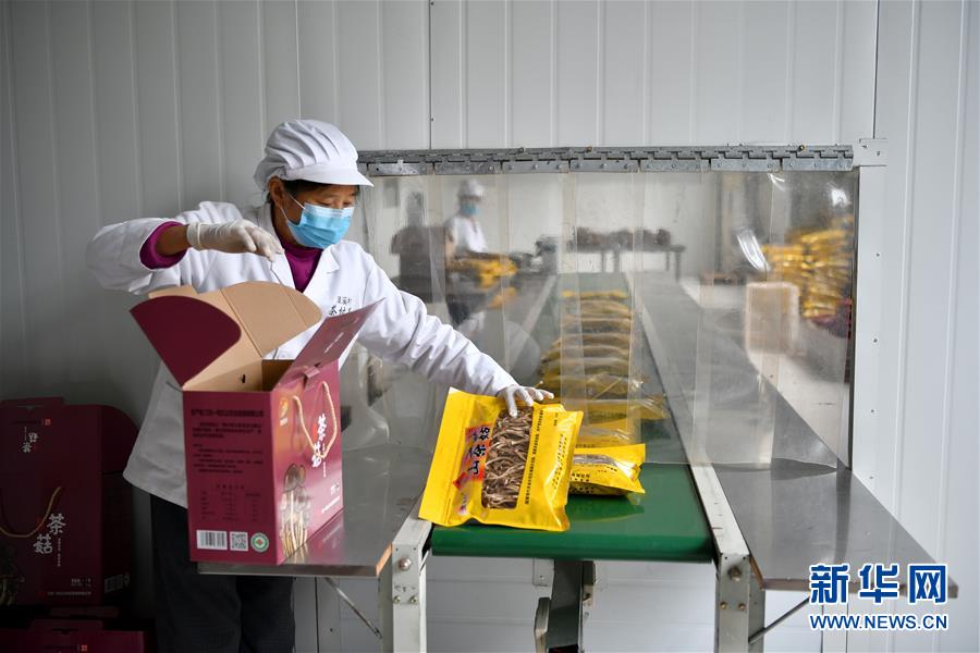 10月19日,江西省赣州市赣县区南塘镇清溪村茶树菇产业基地的员工在车间内包装茶树菇。 新华社记者 李鑫 摄