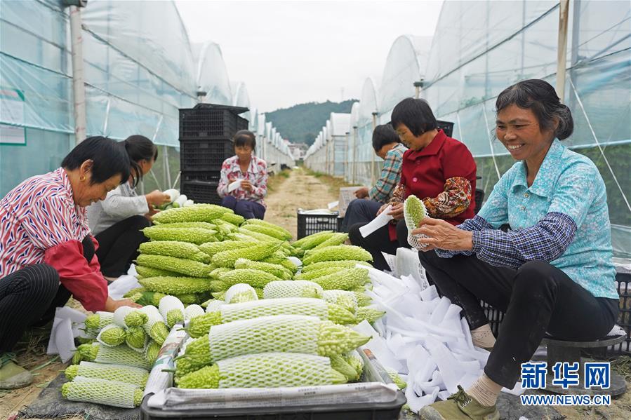 10月21日,村民在位于江西赣州梓山镇潭头村的果蔬种植基地包装刚采摘的苦瓜。 近年来,江西省赣州市于都县梓山镇潭头村以富硒果蔬基地为龙头,成立专业种养合作社,通过“龙头企业+合作社+基地+农户”的模式,打造富硒水果、富硒蔬菜特色品牌,带动200余名村民在当地务工,人均年增收近万元。 新华社记者 万象 摄