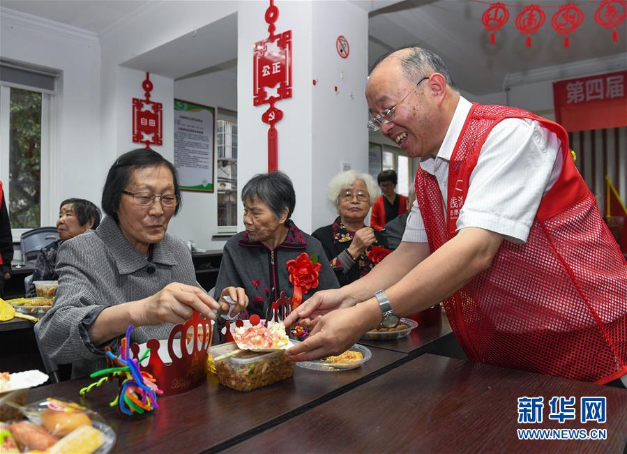 10月21日,志愿者给参加活动的老人送上生日蛋糕。 当日,在重阳节即将来临之际,浙江省慈溪市钱海军志愿服务中心的爱心志愿者们来到慈溪市白果树社区,为社区内一些80岁以上老人举办集体生日会。志愿者们通过这种形式,搭建起老年人交流互动的平台,让他们感受到社会对他们的关爱,同时也通过这个活动弘扬爱老、敬老的传统美德。 新华社记者 徐昱 摄