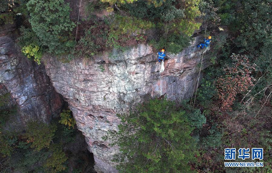 10月21日,在湖南张家界国家森林公园黄石寨景区,张家界市蓝天救援队队员索降到绝壁间捡拾游客丢弃的垃圾(无人机照片)。 当日,在湖南张家界国家森林公园黄石寨景区,张家界市蓝天救援队在开展索降训练的同时,在悬崖绝壁间捡拾游客丢弃的塑料袋、水瓶等垃圾。 这支救援队伍由当地的一些志愿者组成,利用专业设备不定期进入景区捡拾垃圾,用实际行动呼吁广大游客关爱世界自然遗产,共同保护生态环境。 新华社记者 赵众志 摄