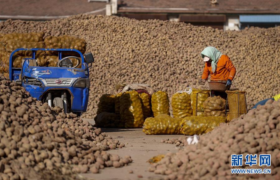 农民在宁夏固原市西吉县将台堡镇马铃薯交易市场装运马铃薯(10月21日摄)。