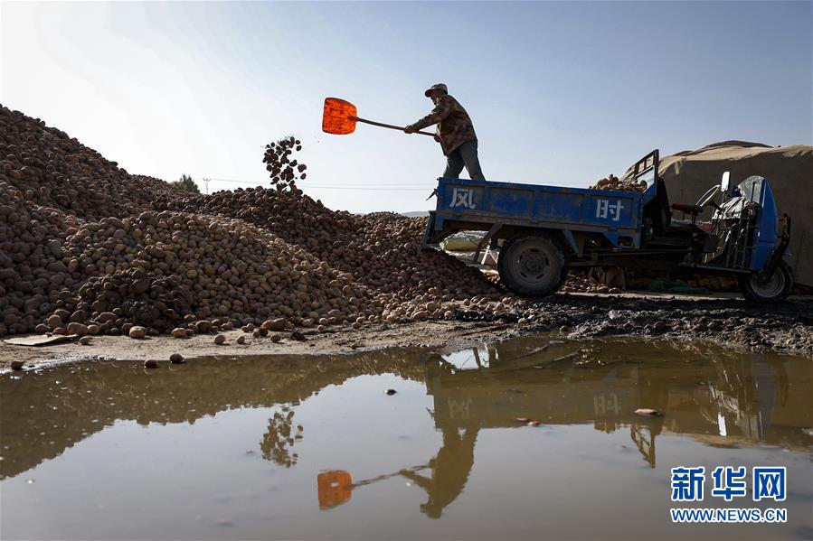 宁夏固原市西吉县将台堡镇马铃薯交易市场,农民将马铃薯卸下农用车(10月21日摄)。新华社记者 冯开华 摄