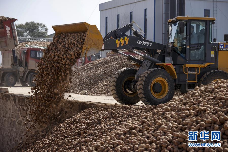 宁夏固原市西吉县马莲乡万里淀粉厂工人在集中堆放收购的马铃薯(10月21日摄)。新华社记者 冯开华 摄