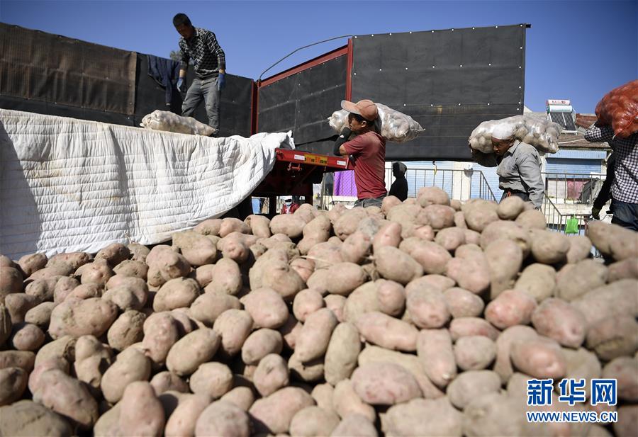 农民在宁夏固原市西吉县将台堡镇马铃薯交易市场装运马铃薯(10月21日摄)。新华社记者 王鹏 摄
