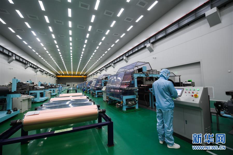 10月22日,花园新能源公司铜箔车间内,工人在生产厚度为6微米的铜箔。作为花园村新能源产业的新兴企业,浙江花园新能源有限公司总投资45亿元的年产5万吨高性能铜箔项目是浙江省重大产业项目,一期项目已经建成投产,该公司也已经通过国家高新技术企业专家认证。 新华社记者 徐昱 摄