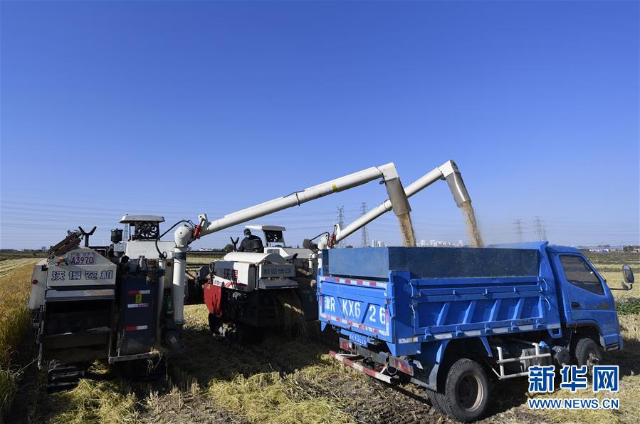10月22日,在天津市津南区小站镇,两台农机将稻谷装车。 近日,天津市津南区小站镇的小站稻进入集中收割期。小站稻种植历史悠久,米质优异,是我国著名的水稻品种。2020年,天津小站稻农产品获得农产品地理标志登记证书,被正式列入我国农产品地理标志保护行列。 新华社记者 李然 摄