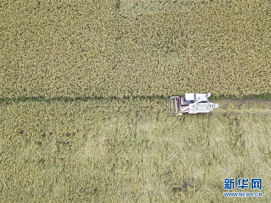 10月22日,工作人员驾驶收割机在海口龙华区龙泉镇新江村收割晚稻(无人机照片)。 近日,海口地区的晚稻陆续成熟。在海口龙华区龙泉镇新江村,当地村民抢抓农时,趁晴朗天气抓紧收割晚稻。 新华社记者 蒲晓旭 摄
