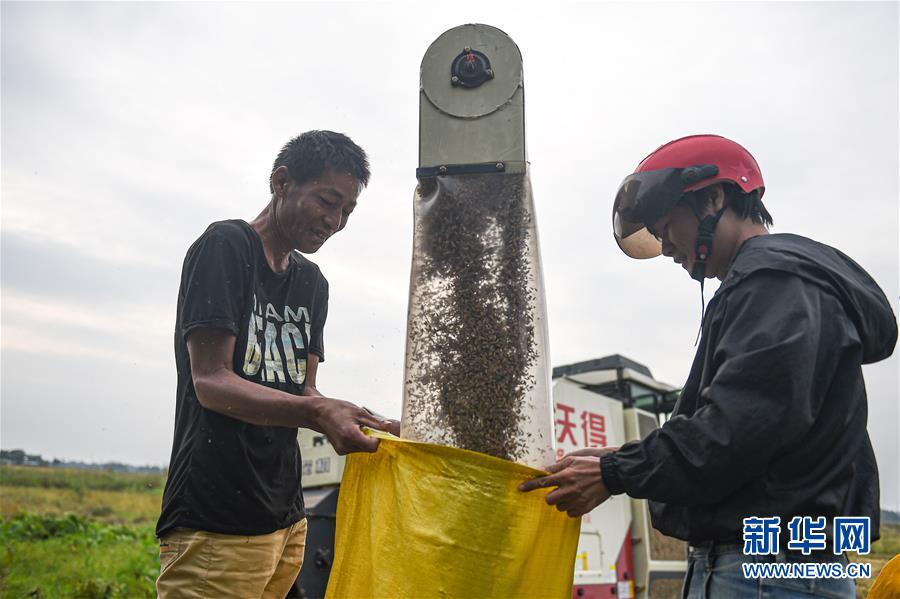 10月22日,村民在海口龙华区龙泉镇新江村将收割的水稻装袋。 近日,海口地区的晚稻陆续成熟。在海口龙华区龙泉镇新江村,当地村民抢抓农时,趁晴朗天气抓紧收割晚稻。 新华社记者 蒲晓旭 摄