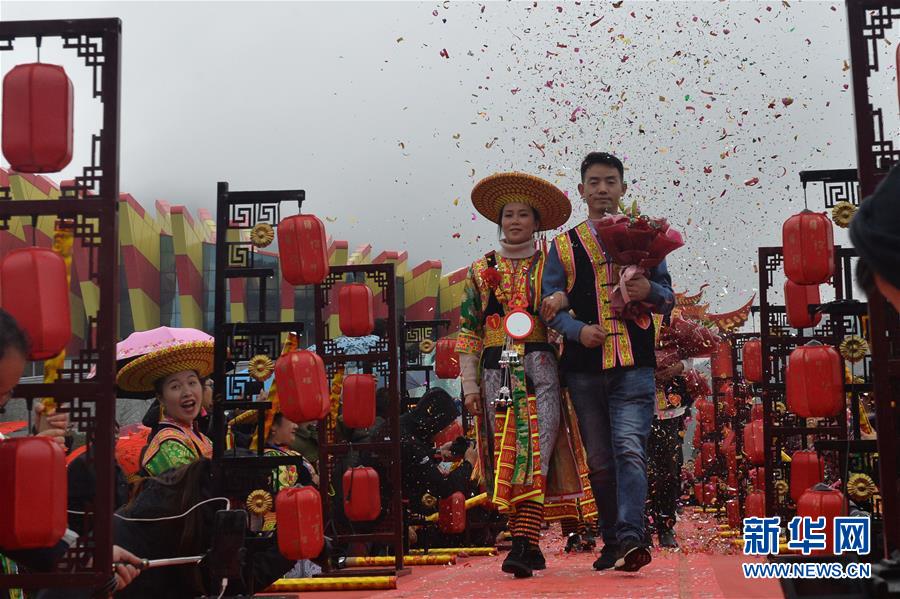10月26日,在湖南省邵阳市隆回县虎形山瑶族乡崇木凼村,新人参加扶贫脱单集体婚礼。 当日,湖南省邵阳市隆回县举行扶贫脱单集体婚礼,32对新人参加了婚礼,婚礼按照当地花瑶婚庆礼仪和习俗举办。 新华社记者 戚晓毅 摄
