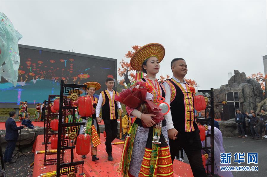 10月26日,在湖南省邵阳市隆回县虎形山瑶族乡崇木凼村,新人参加扶贫脱单集体婚礼。 当日,湖南省邵阳市隆回县举行扶贫脱单集体婚礼,32对新人参加了婚礼,婚礼按照当地花瑶婚庆礼仪和习俗举办。 新华社记者 戚晓毅 摄
