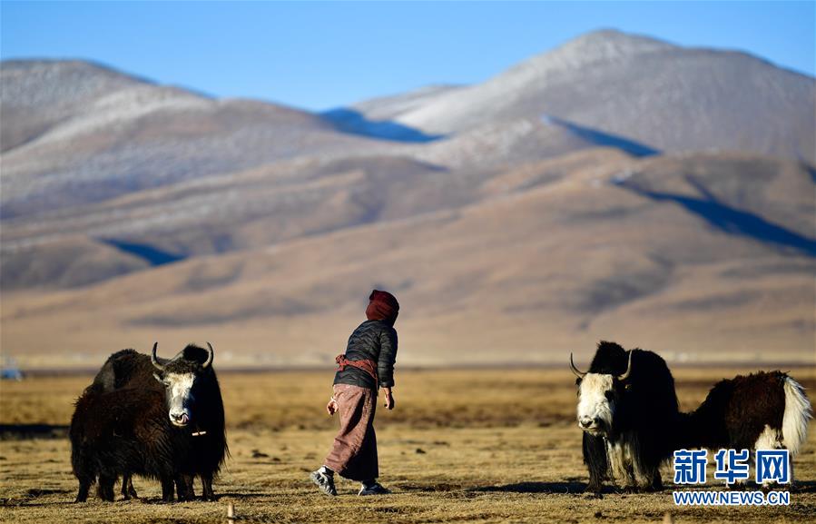 10月28日,青海省玉树藏族自治州称多县珍秦镇二村牧民尼玛措毛在拴牦牛准备给牦牛挤奶。 日前,位于青海省玉树藏族自治州称多县的嘉塘草原生机勃勃。嘉塘草原地处三江源生态保护区的核心区,畜牧业是当地赖以生存和发展的支柱产业。近年来,当地政府通过调整产业结构,构建划区轮牧、科学养畜、草畜平衡、协调发展为主的生态畜牧业,形成生态保护和畜牧业生产的良性循环。 新华社记者 张龙 摄