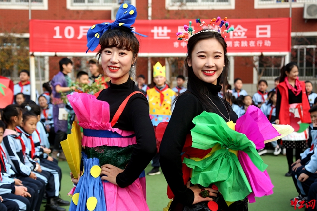 10月30日,山东省枣庄市市中区新时代文明实践志愿者在逸夫小学展示利用废旧物品设计制作的环保时装。