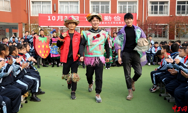 10月30日,山东省枣庄市市中区新时代文明实践志愿者在逸夫小学展示利用废旧物品设计制作的环保时装。