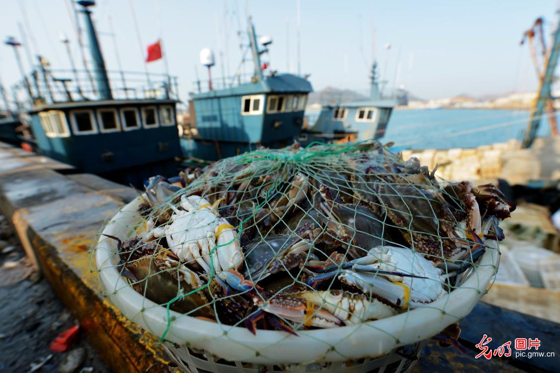 2020年10月30日,这是在青岛市崂山中心渔港卸下的海捕梭子蟹。当下,正是海捕梭子蟹肥美之时,山东省青岛市崂山区中心渔港组织渔民抢抓时间集中分拣,筛选优质活蟹装车供应各地市场,助力渔民增收致富。(王海滨摄/光明图片)