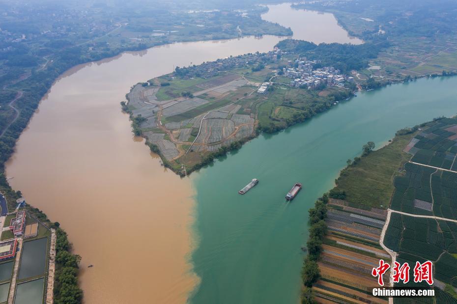 10月31日,航拍广西南宁三江口。三江口位于南宁市江南区江西镇宋村附近,为左江和右江的汇合点、邕江零公里处。近日,夹杂泥沙的左江呈现出黄色,与清澈的右江形成了独特的“鸳鸯江”景观。中新社记者 陈冠言 摄