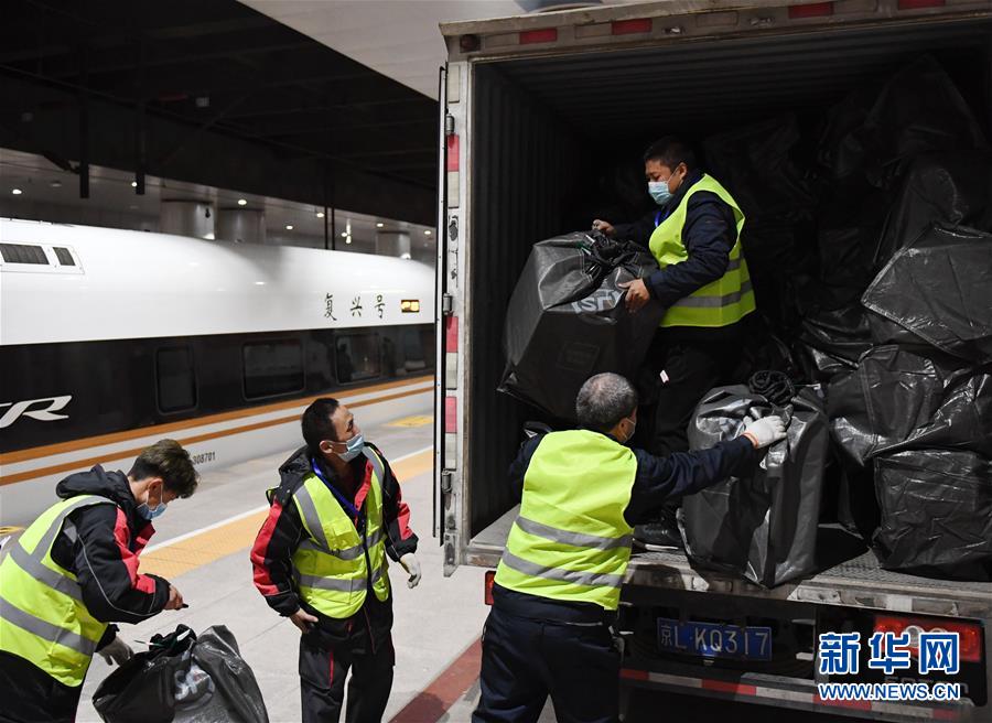 11月1日,工作人员在北京西站将货物卸下准备装车。 当日,铁路“双11”电商黄金周运输服务启动,持续至11月20日。铁路部门充分发挥高铁成网运行和安全快捷等优势,优化运力供给,首次试点复兴号动车组整列装运快件,努力满足人民群众日益增长的物流服务需求。 新华社记者张晨霖摄