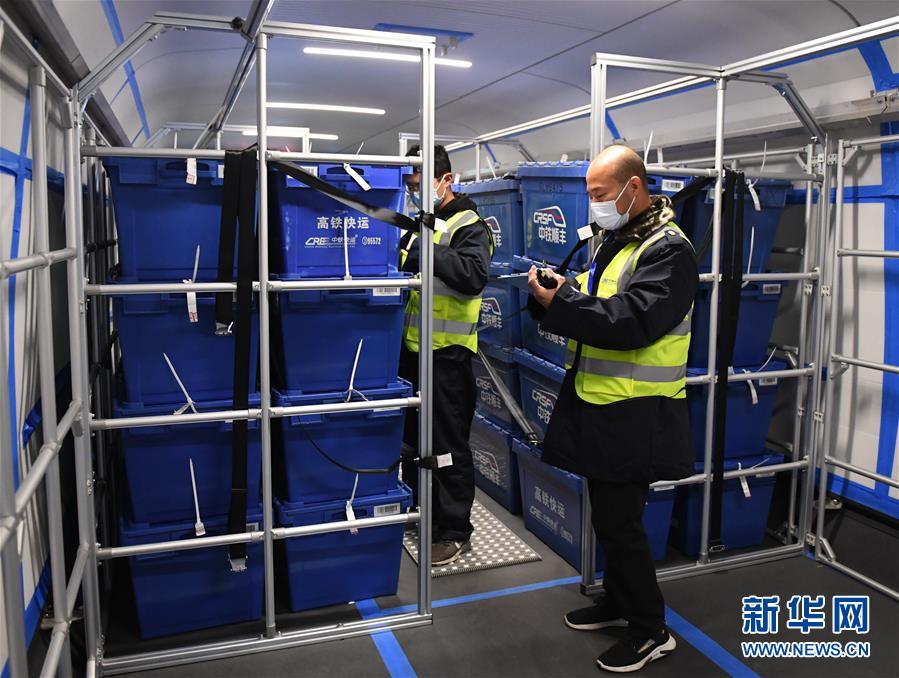 11月1日,工作人员在北京西站检查货物装车情况。 当日,铁路“双11”电商黄金周运输服务启动,持续至11月20日。铁路部门充分发挥高铁成网运行和安全快捷等优势,优化运力供给,首次试点复兴号动车组整列装运快件,努力满足人民群众日益增长的物流服务需求。 新华社记者张晨霖摄