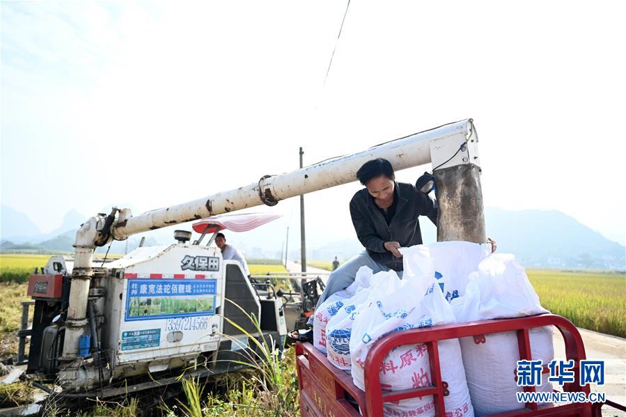 广西柳州:深秋稻香 11月1日,在广西柳州市柳江区进德镇泗浪村,农民在装运刚收割的稻谷。