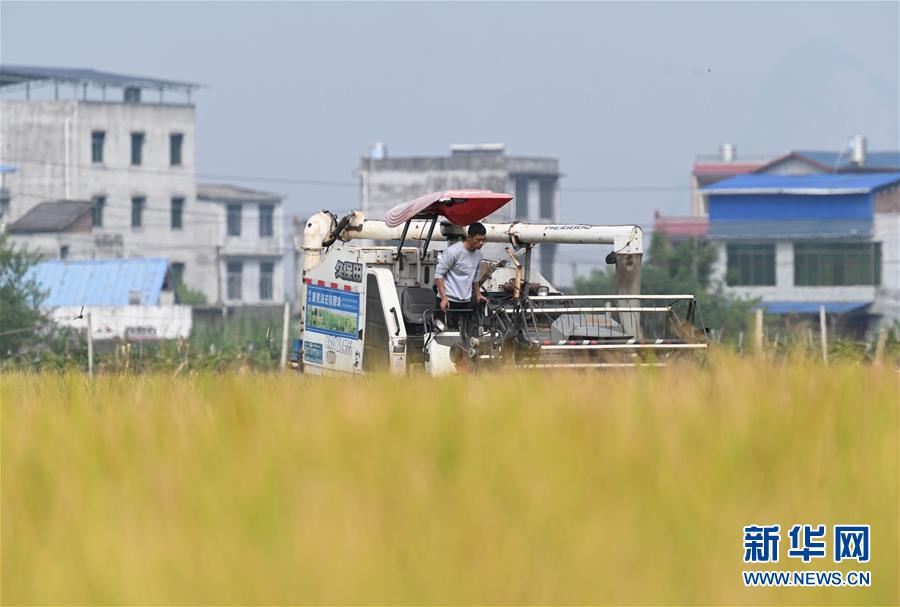 11月1日,在广西柳州市柳江区进德镇泗浪村,农民驾驶收割机在稻田里收割晚稻。新华社发(黎寒池 摄)