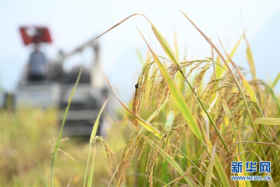 11月1日,在广西柳州市柳江区进德镇泗浪村,农民驾驶收割机在稻田里收割晚稻。新华社发(黎寒池 摄)