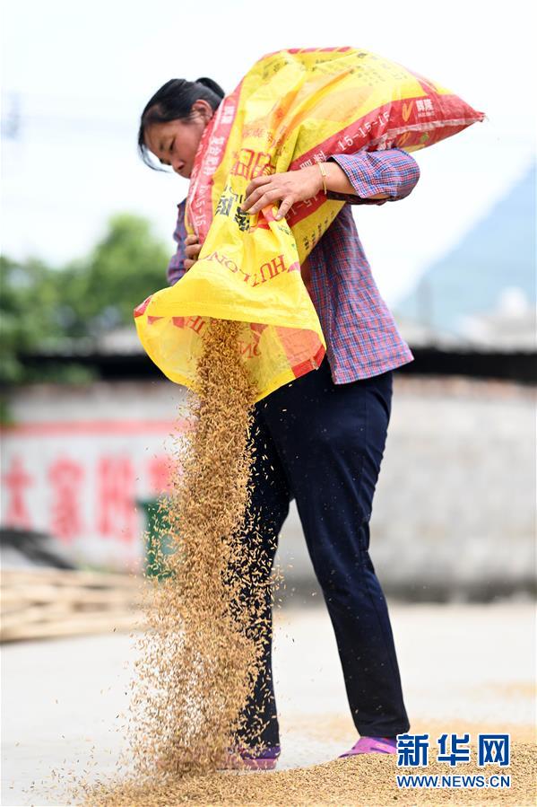 11月1日,在广西柳州市柳江区进德镇泗浪村,农民韦凤育晾晒刚收割的稻谷。新华社发(黎寒池 摄)
