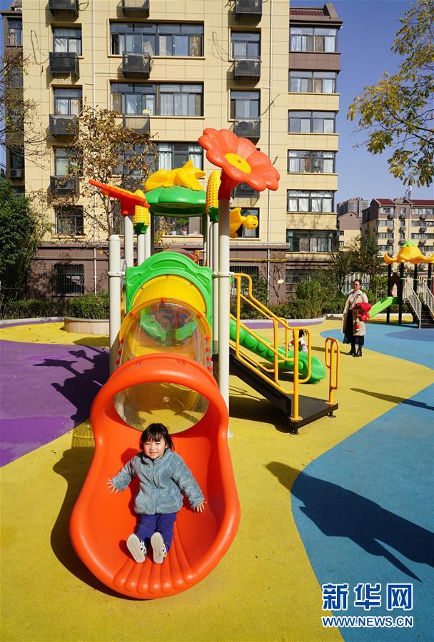 11月2日,小朋友在明德门北区社区改造后的儿童广场玩耍。 经过不到一年的紧张施工,西安市雁塔区明德门北区老旧小区改造项目近日正式完工,小区内的基础设施、居住环境、房屋功能得到明显提升,使当地社区居民拥有了更好的居住条件。 新华社记者 邵瑞 摄