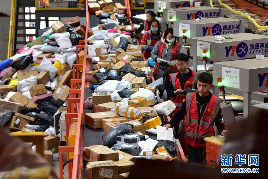 11月3日,在贵州快递物流园圆通速递贵州分拨中心,工作人员在分拣货件。 “双11”将近,位于贵州省龙里县的贵州快递物流园内一派繁忙景象,电商企业拓宽进货渠道、全力备足货源,快递企业更新智能分拣设备、增派人手,积极应对即将到来的购物和物流高峰。 新华社发(龙毅 摄)