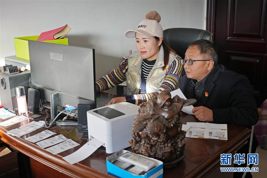 11月3日,在洛川县的一家万平洛川果业加盟店,屈万平(右)与工作人员查看订单。新华社记者 才扬 摄