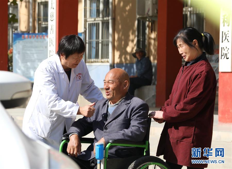 11月3日,王竹梅(左)在医院里和晒太阳的老人聊天。新华社记者 杨静 摄