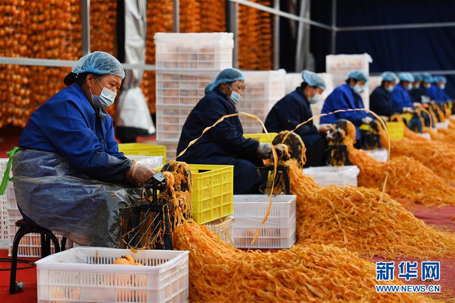 时下,陕西省渭南市富平县的柿子迎来丰收,当地群众抓紧时机加工杮饼。 近年来,富平县大力推动柿子产业发展,全县柿子种植总面积已达36万亩。柿子产业带动全县2400多户贫困户脱贫,成为当地群众致富增收的支柱产业。 新华社记者陶明摄