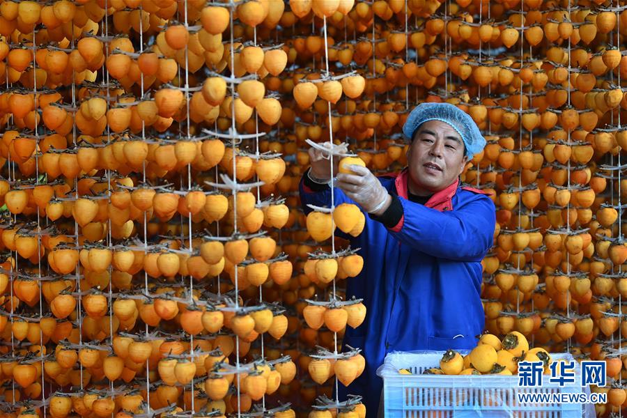 11月3日,村民在富平县天玺农业小镇的社区工厂把削过皮的杮子上架晾晒。新华社记者陶明摄