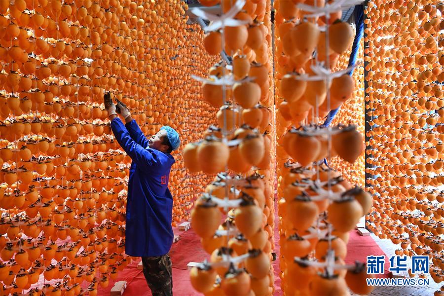 11月3日,村民在富平县天玺农业小镇的社区工厂为上架的杮子清理果面。新华社记者陶明摄