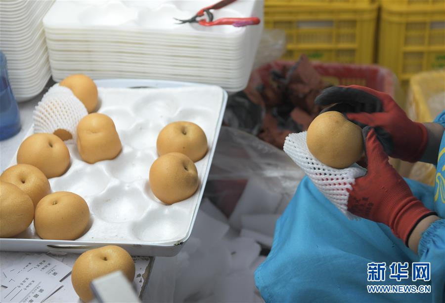 11月5日,在石家庄晋州市一家果品进出口企业的包装车间,工人在挑选、包装梨果。 河北省石家庄晋州市梨果栽培历史悠久,现有梨树种植面积17万亩、鲜梨国际标准化出口示范基地11个。当地大力推广梨果无公害标准化生产,并发展梨果产业化经营,形成了规模化种植、标准化生产、商品化处理、品牌化销售格局。梨果产业成为当地农民致富增收的重要支柱产业。 新华社发(蒲东峰 摄)